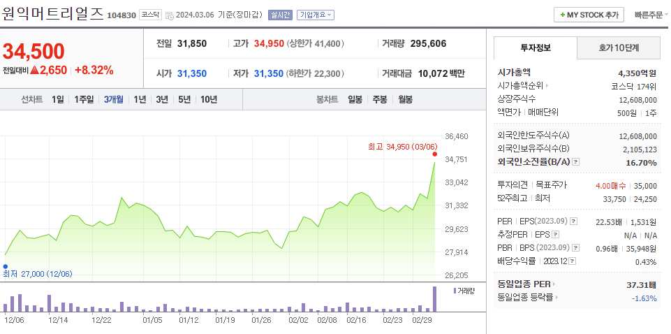 원익머트리얼즈 현재 주가는 31,850원이며 전일 대비 -350원의 모습을 보이고 있습니다. 원익머트리얼즈의 주주현황을 살펴보면 원익홀딩스(외 1인)이 지분 45.71%를 소유하고 있습니다. 원익머트리얼즈는 반도체 및 관련장비 기업으로 장중 기준으로 주가는 31,850원 입니다. 원익머트리얼즈의 시가 총액은 4350억 원이며 발행 주식수는 16.70주 입니다. 외국인 보유 비중은 44,588% 이며 장중 거래량은 12,608,000를 기록했습니다. 매출액은 2,995억 원, 영업이익은 888억 원을 달성했습니다. EPS는 3,593원이며 원익머트리얼즈 주식 배당수익률은 2.82% 입니다.