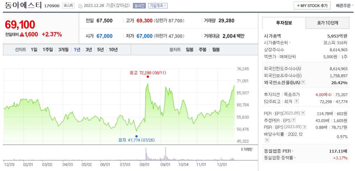 이 글에서는 동아에스티 주가 전망과 목표 주가, 기업 정보에 대해서 설명합니다. 주식 시장에서 중요한 것은 미래의 기업 가치를 예측하고 선제적으로 움직이는 것입니다. 투자 대상을 선택하기 전에 현재 기업의 현황과 데이터를 확인하는 것이 필요합니다. 동아에스티 주식의 주요 현황과 투자 정보를 확인하시고 주식 투자에 도움을 줄 자료들을 모아 두었으니 투자 결정에 도움을 받으시길 바랍니다..