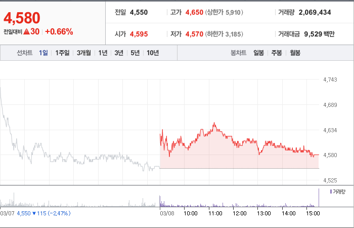 팬오션은 현재 주가가 4,580원이며 전일 대비 -24.67원 하락한 상태입니다. 주주 현황을 살펴보면 하림지주(외 12인)이 지분의 54.92%를 소유하고 있습니다. 팬오션은 해상운수 기업으로, 현재 주가는 4,580원이며 시가 총액은 2조4483억 원입니다. 발행 주식수는 534,569,512주이며, 외국인 보유 비중은 14.04%입니다. 장중 거래량은 2,120,932를 기록했고, 매출액은 33,328억 원을 달성했습니다.