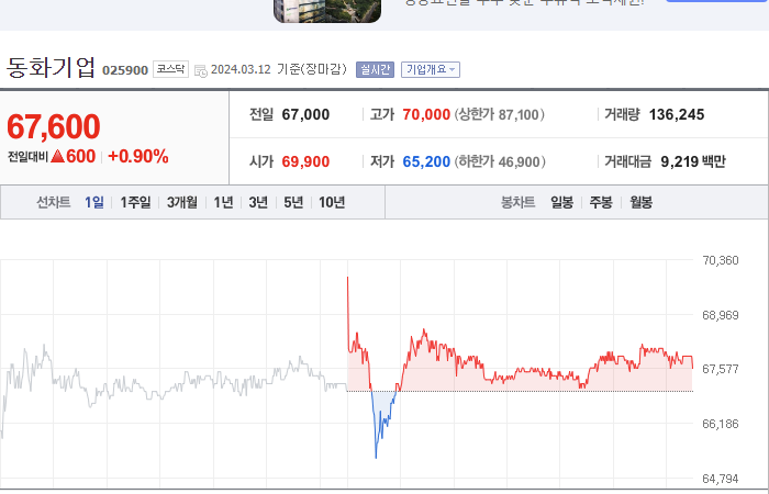동화기업의 현재 주가는 67,000원이며 전일 대비 -1.33원의 변동을 보이고 있습니다. 주주현황을 살펴보면 DONGWHA INTERNATIONAL CO.,LTD(외 12인)이 지분의 66.84%를 소유하고 있습니다. 동화기업은 건축자재 기업으로, 현재 주가는 67,000원입니다. 시가 총액은 1조 3,666억 원이며 발행 주식수는 20,215,395주입니다. 외국인 보유 비중은 42.10%이며 거래량은 83,099주를 기록했습니다. 매출액은 7176억 원입니다.