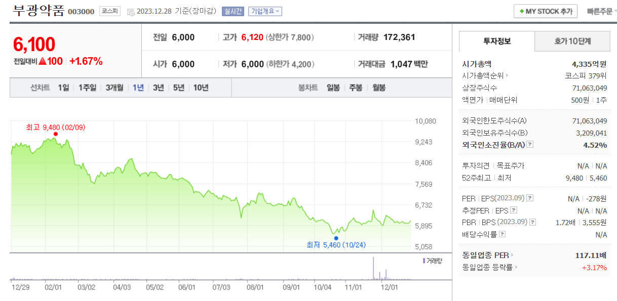 부광약품 현재 주가는 6,100원이며 전일 대비 -0.97원의 모습을 보이고 있습니다. 부광약품의 주주현황을 살펴보면 OCI홀딩스(외 1인)이 지분 11.70%를 소유하고 있습니다. 부광약품는 제약 기업으로 장중 기준으로 주가는 6,100원 입니다. 부광약품의 시가 총액은 4335억 원이며 발행 주식수는 4.87주 입니다. 외국인 보유 비중은 175,930% 이며 장중 거래량은 71,063,049를 기록했습니다. 매출액은 1,009억 원, 영업이익은 -2억 원을 달성했습니다.