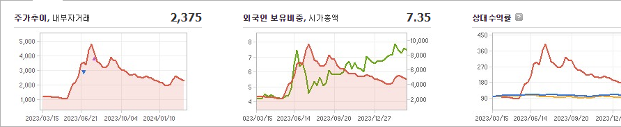 삼부토건은 현재 주가가 2,375원으로 전일 대비 -25원 하락한 상태입니다. 주주현황을 살펴보면 이 회사의 지분 중 8.12%를 소유하고 있습니다. 삼부토건은 건설 기업으로서, 장중 기준 주가는 2,375원입니다. 이 회사의 시가 총액은 5495억 원이며 발행 주식수는 204,259,254주입니다. 외국인 보유 비중은 7.35%이며, 장중 거래량은 10,265,315주입니다. 또한, 매출액은 4,612억 원을 기록했습니다.